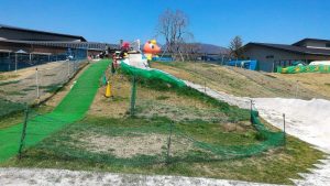 30分600円で、芝そり遊び、ふわふわスライダー、恐竜トランポリンのキッズパークで楽しもう!
