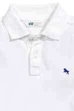 商品説明:コットンピケ素材の半袖ポロシャツ。リブの襟付きで、ボタン留め。フロントに刺繍のワンポイント入り。両サイドに短いスリット入り。バックのほうが少し長めになっています。