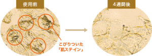 紫外線などの影響により、肌のくすみの原因である「肌ステイン」(コーヒーやたばこで、歯や歯茎の色が黒くなったりするのと同じですね)が、加齢によりどんどん蓄積され、肌はくすんでいきますが、このスキンクレアクレンズオイルを使うと、4週間で肌ステインが取り除き、透明感のある肌に近づくことが、アテニアの実験でわかったようです。